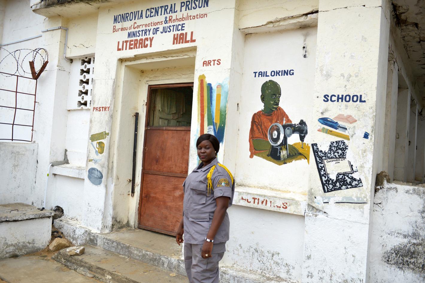 Liberian Correctional Officer standing in front of Monrovia Central Prison building ©UNMIL Photo: Clement Atitwa
