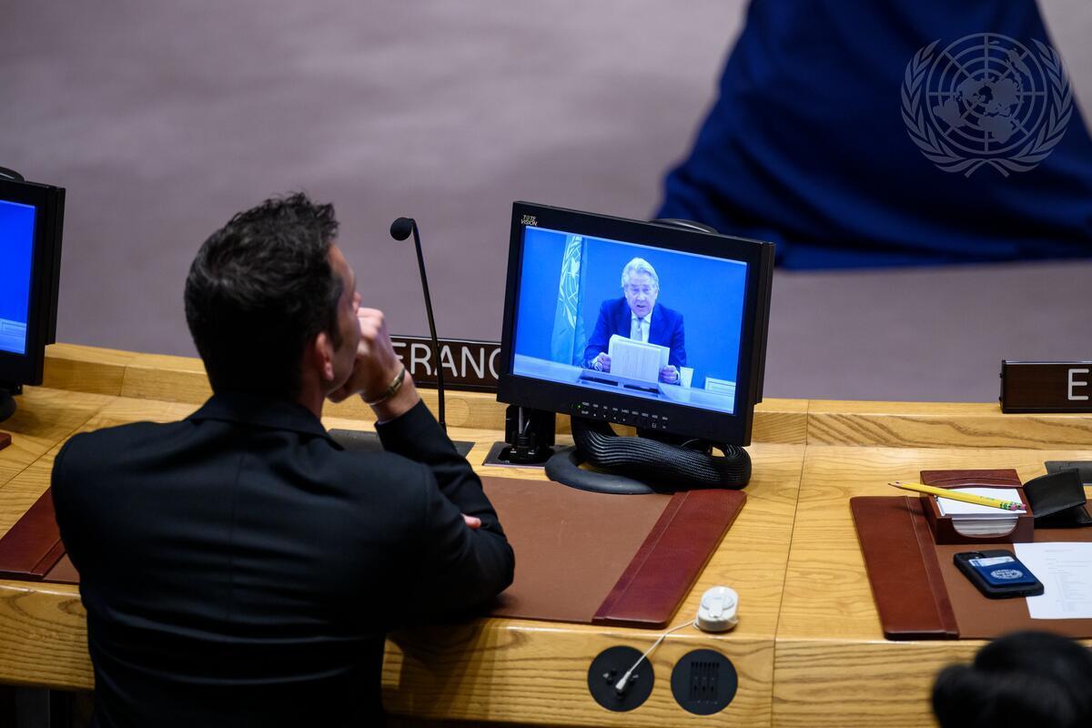 Tor Wennesland, Special Coordinator for the Middle East Peace Process (on screen), addresses the Security Council meeting on the situation in the Middle East, including the Palestinian question. (UN Photo/Loey Felipe - New York, 18 January 2023)