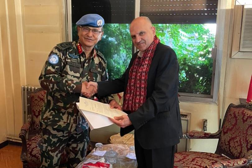 Lieutenant General Ishwar Hamal bids farewell to Senior Syrian Arab Delegate, Commanding Brigadier General Engineer Mazen Ibrahim Younes