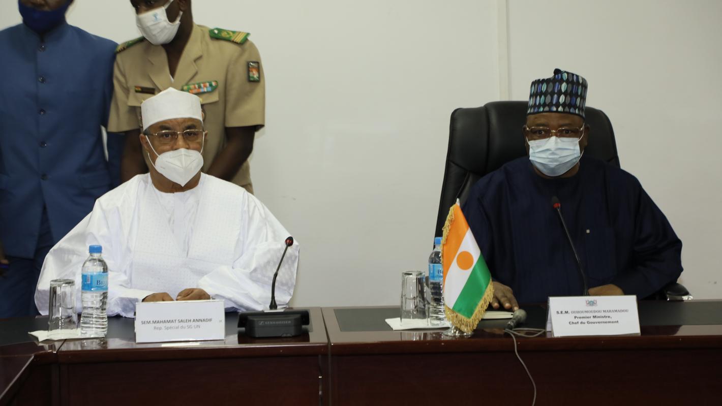 Niamey, 12 novembre 2021 - Le Représentant Spécial du Secrétaire Général et Chef du Bureau des Nations Unies pour l’Afrique de l’Ouest et le Sahel (UNOWAS), Mahamat Saleh ANNADIF et le Premier Ministre de la République du Niger, Ouhoumoudou MAHAMADOU, ont lancé, ce jour, le projet pour le renforcement de la cohésion sociale et la consolidation du dialogue national au Niger.